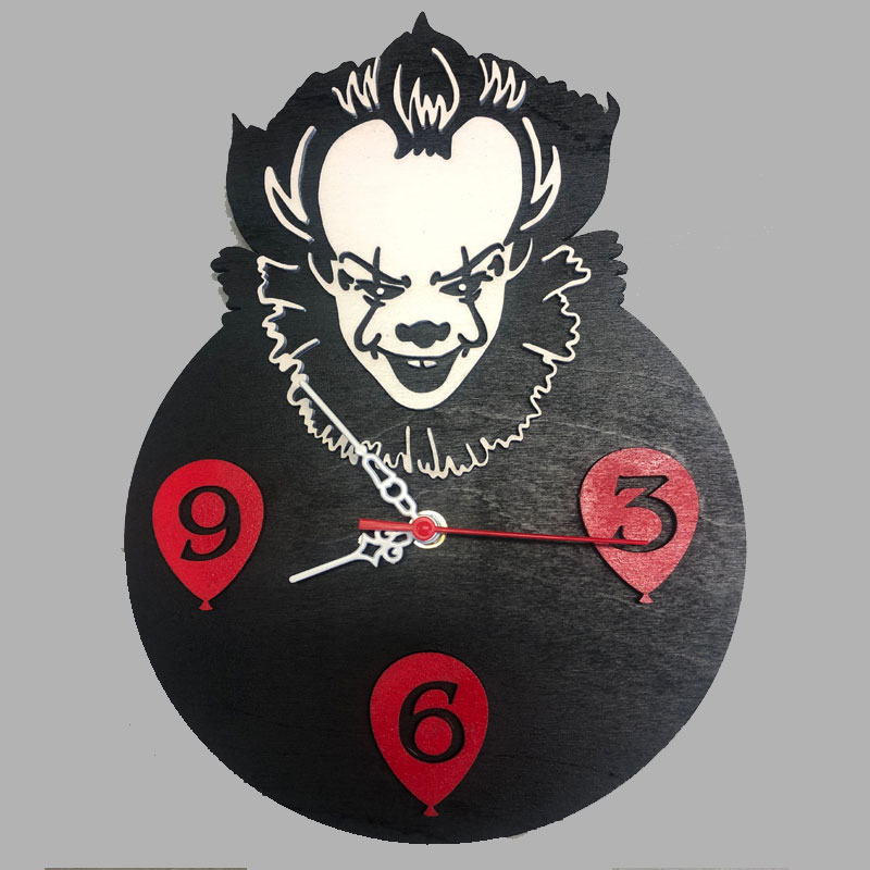 Az idő és a félelem találkozása – a Gravírozott “Az Óra” egy igazán különleges darab, Pennywise-ot ábrázolja. Ez az egyedi óra nemcsak időt mér, hanem egy izgalmas dekoráció is lehet bármelyik rajongó számára. Az órát díszítő gravírozott mintázat a klasszikus horror és a modern dizájn ötvözete.Ezáltal remekül passzol a sötétebb, misztikus hangulatú helyiségekhez.