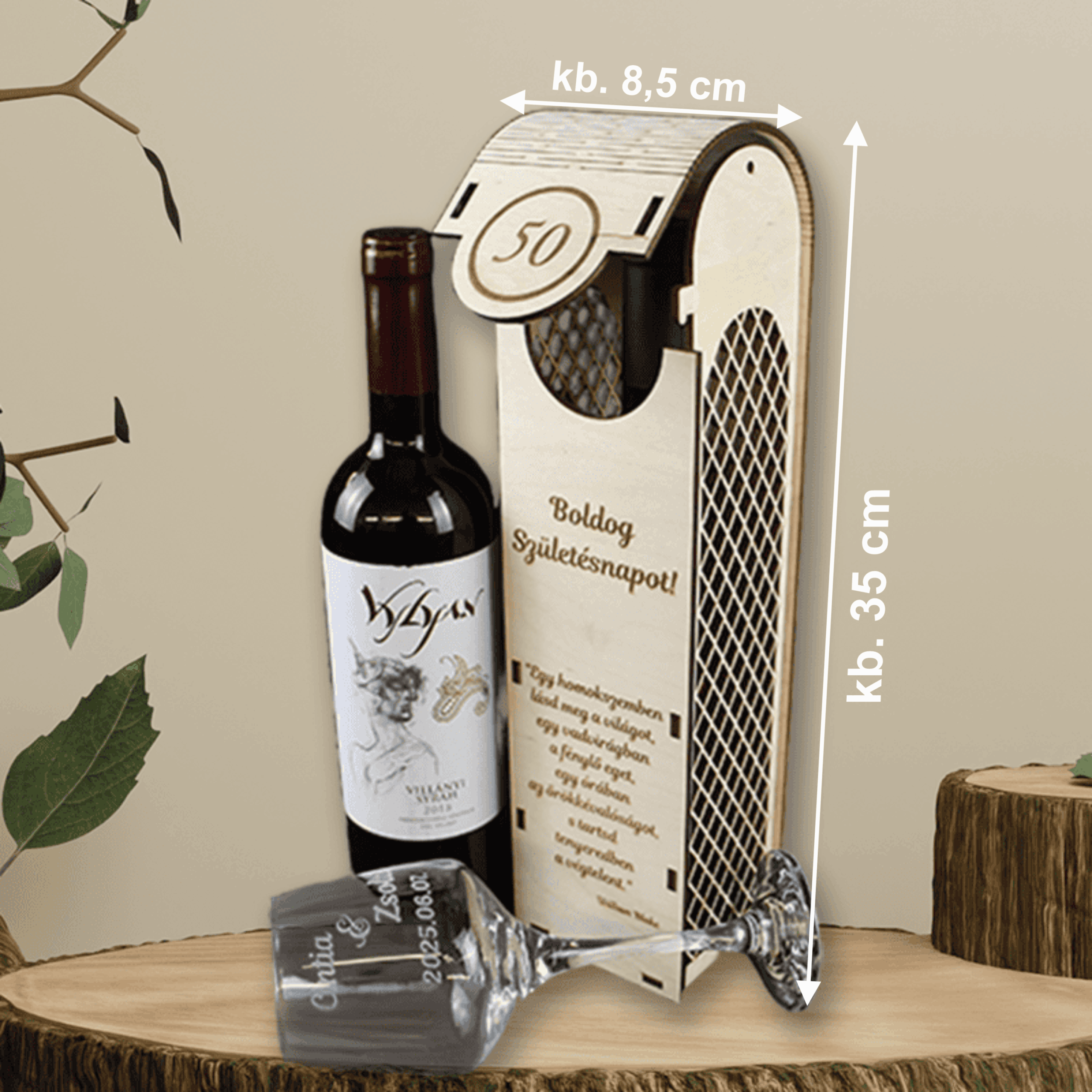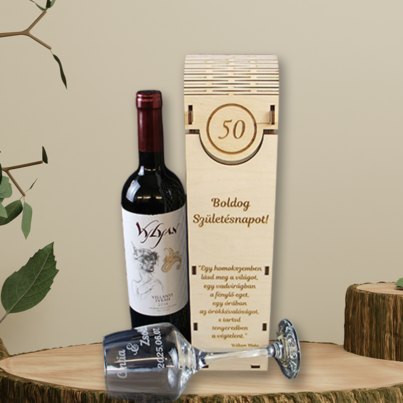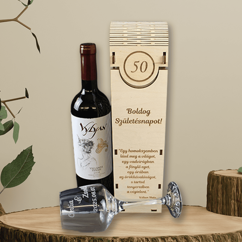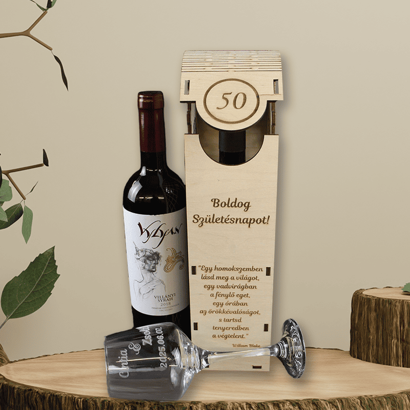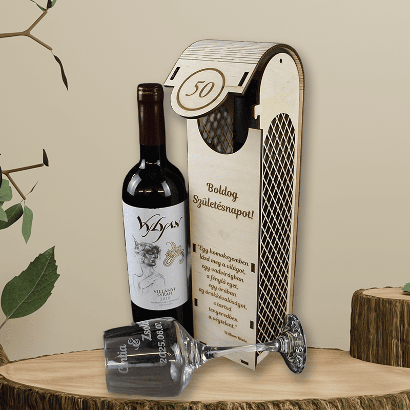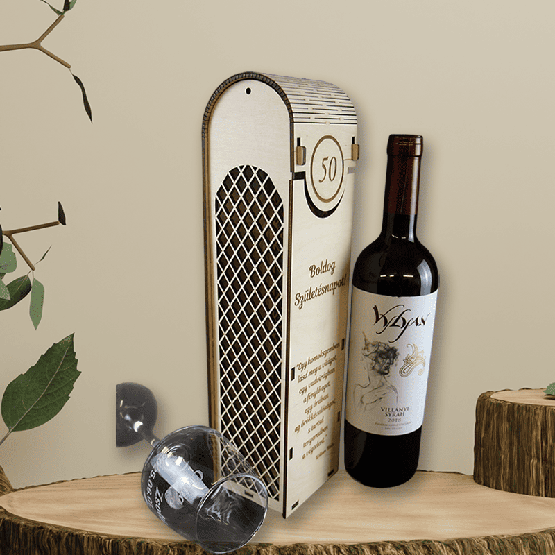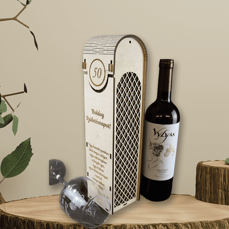 A természetes fából készült, prémium kidolgozású doboz előlapján egyedi gravírozás kérhető: szám (pl. 50 év), név, idézet vagy jókívánság. A hajlított tető és a finoman kidolgozott részletek emelik ki az ajándék exkluzivitását. Tökéletes választás születésnapra – különösen kerek évfordulókra!