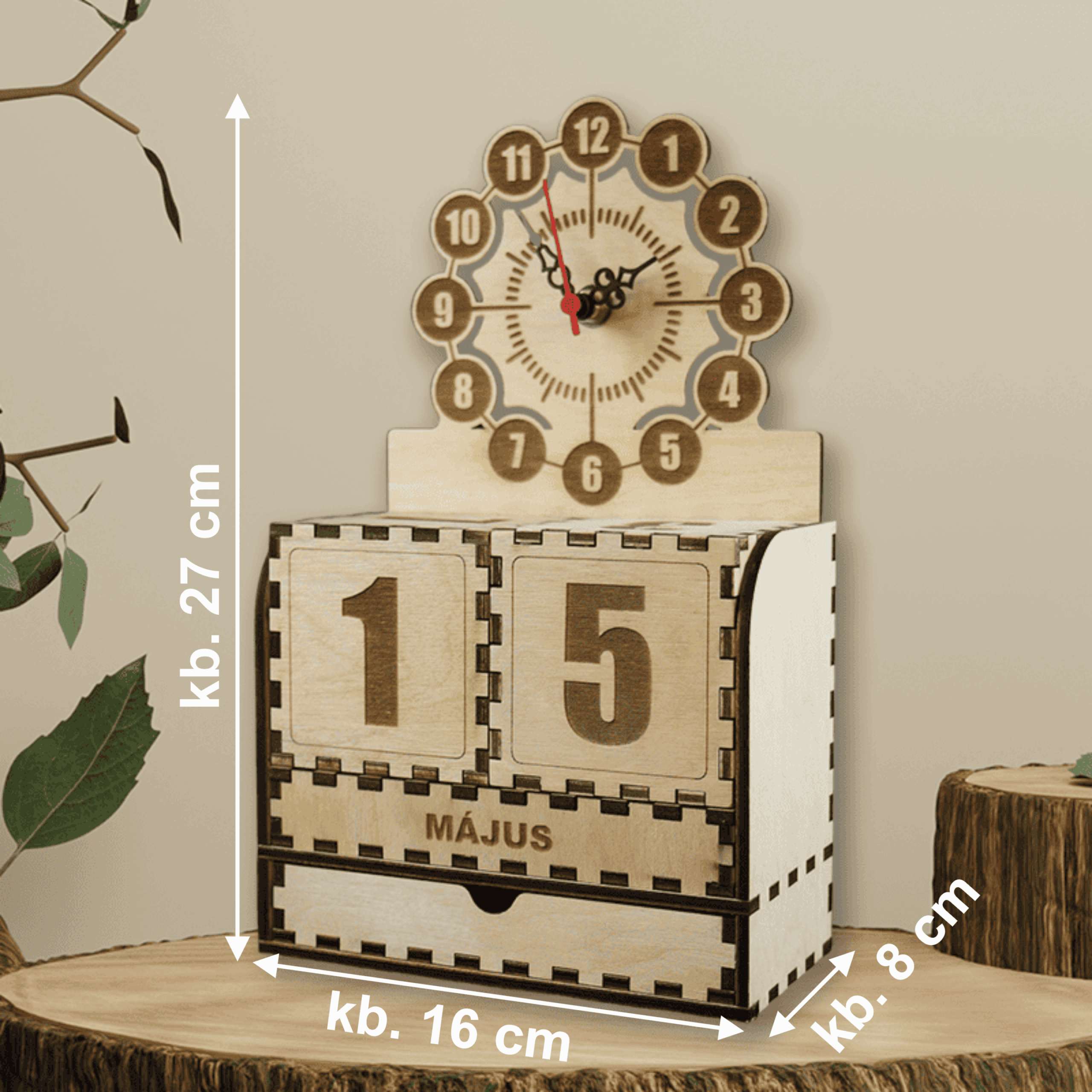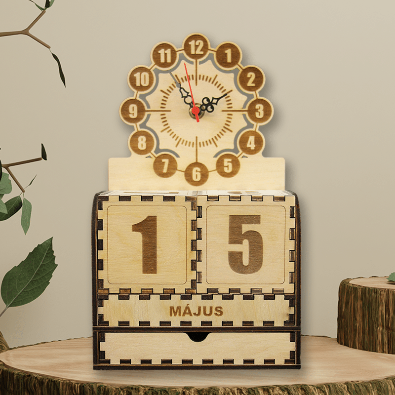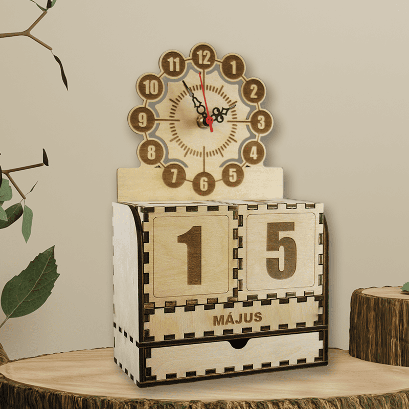 A természetes színű, lézervágott faelemek precízen illeszkednek egymáshoz. A naptárrész két darab forgatható kockából és egy cserélhető hónapjelző lapból áll, így minden nap friss dátum jeleníthető meg – akár örökre. A tetején lévő mutatós óralap klasszikus hangulatot áraszt, miközben segít szem előtt tartani az időt.