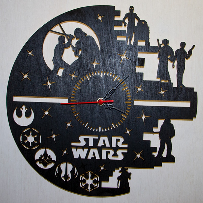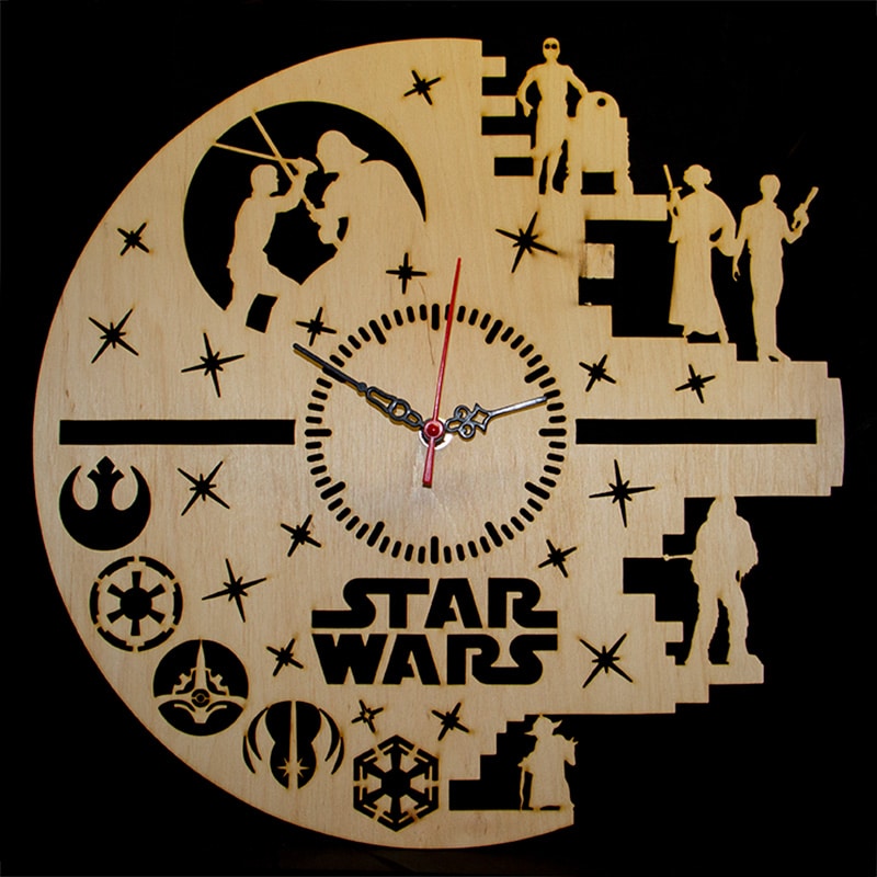 A Gravírozott Star Wars Óra egy egyedi, préselt falemezből készült falióra, amely a Star Wars univerzum ikonikus elemeit jeleníti meg. Különleges kialakítása és igényes megmunkálása révén tökéletes választás a filmrajongók számára.